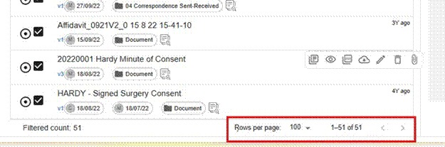 - Increase the Rows per page setting to the maximum (100 is recommended) so more documents are visible on screen at once. This option is at the bottom right of the document list.