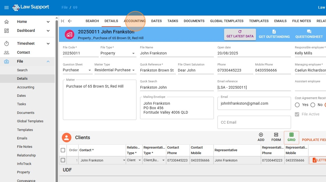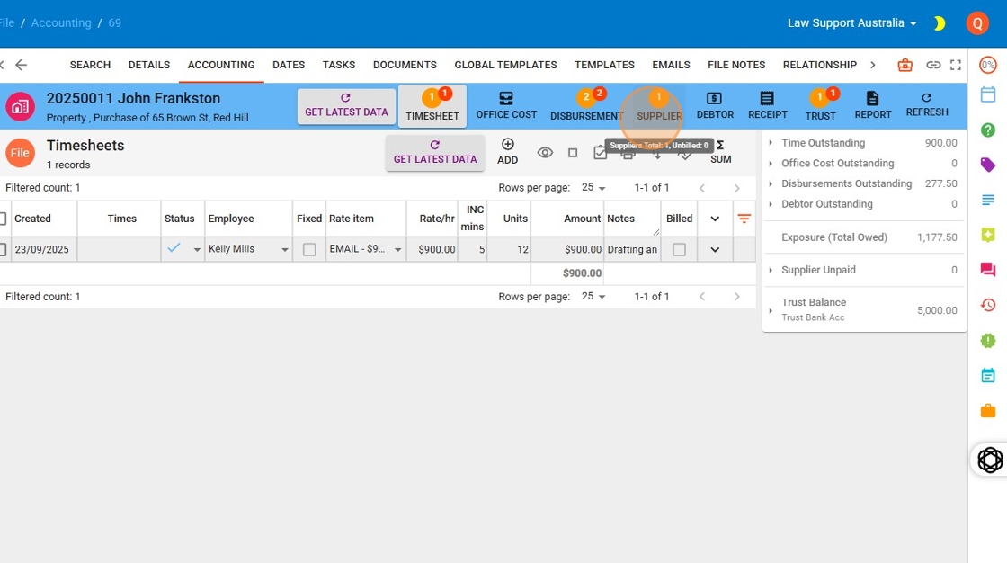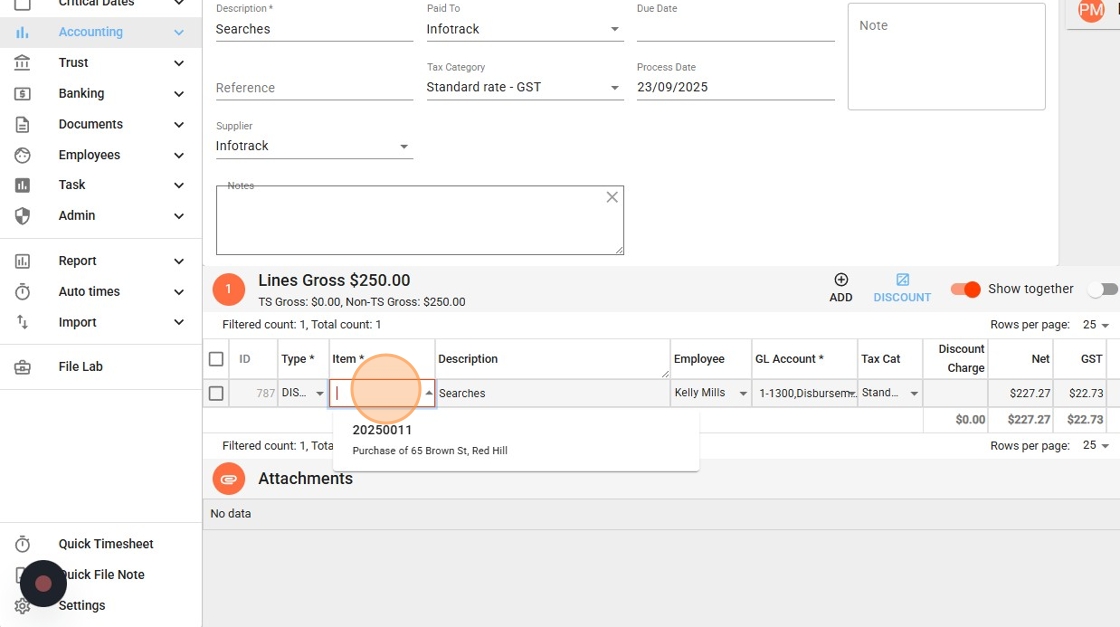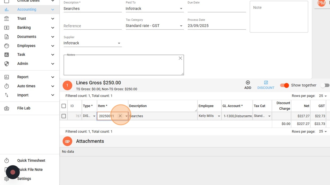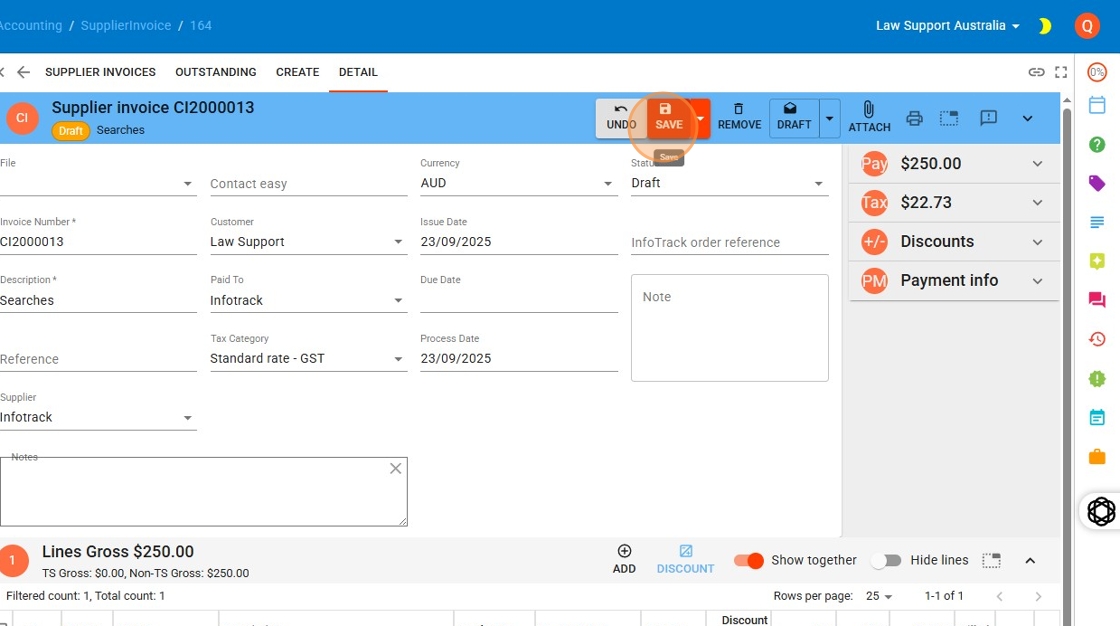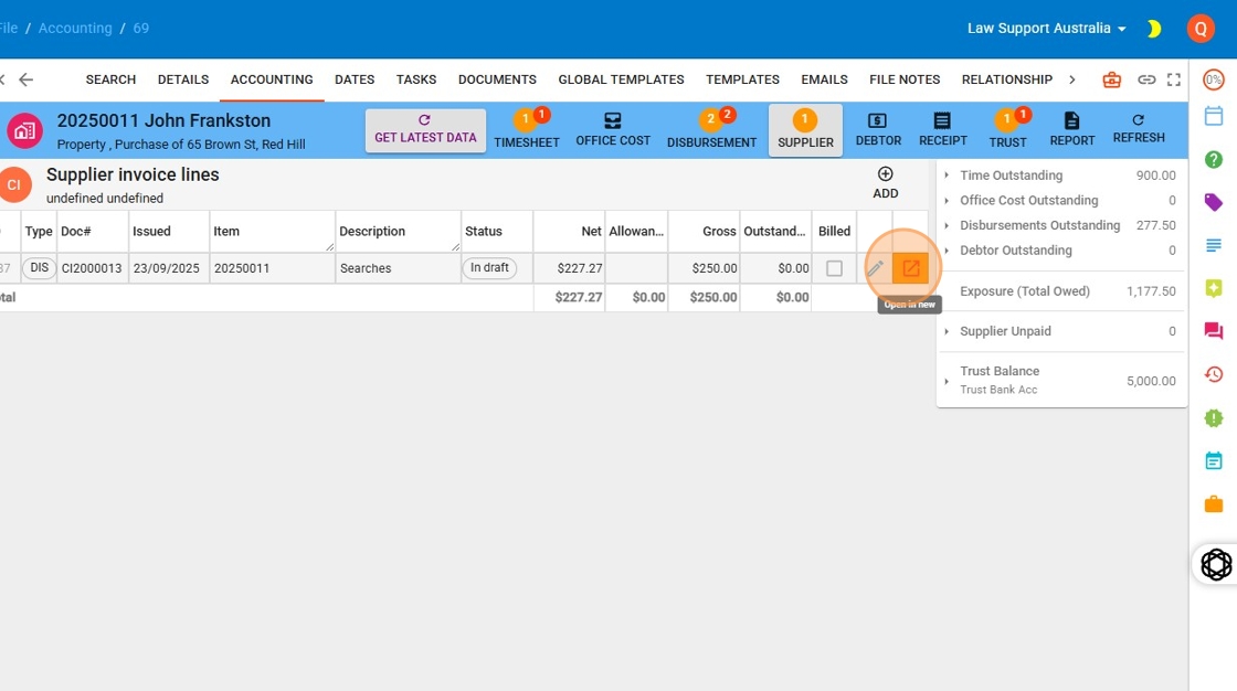 From the file, click the square with the arrow icon (also known as the ‘Law App go-to icon’) at the end of the supplier invoice line.
