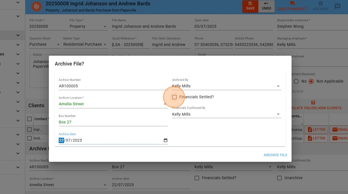 - Once all financial items have been correctly finalised, go to the file in question and click the Archive button (as shown in the image).