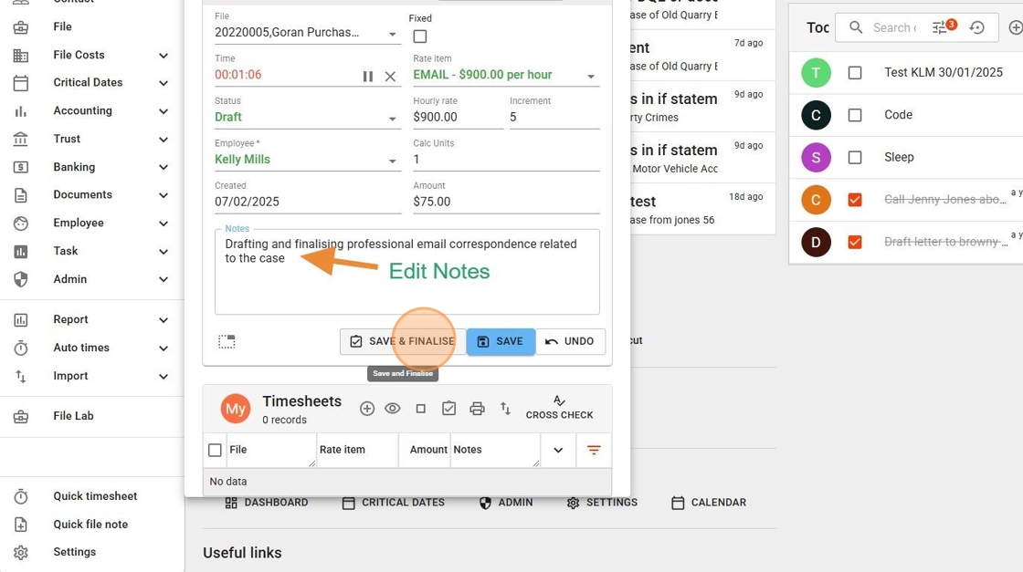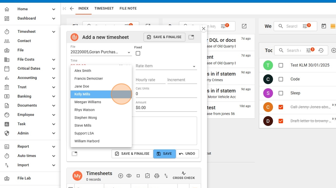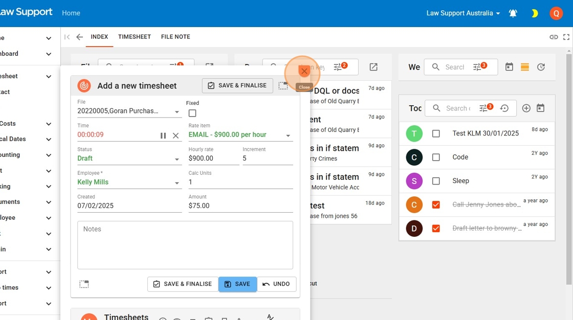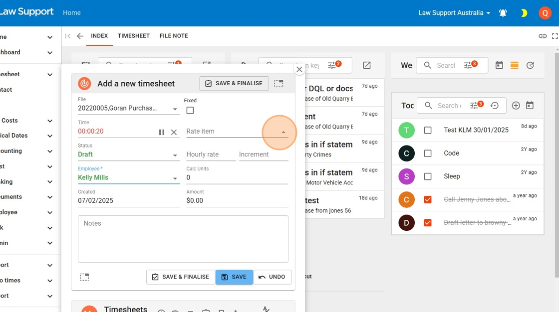 A clear, step-by-step guide to adding timesheet entries in Law App, including selecting the matter, choosing the correct rate, entering units or time, marking entries as billable, and saving or editing existing entries.