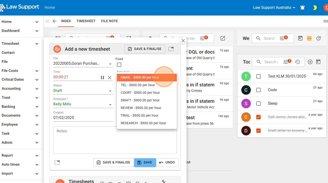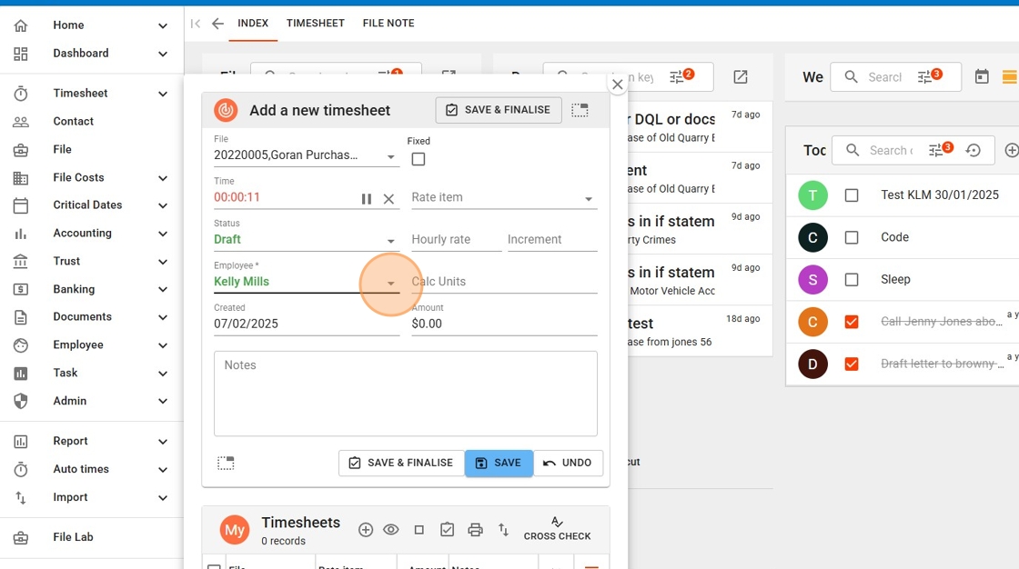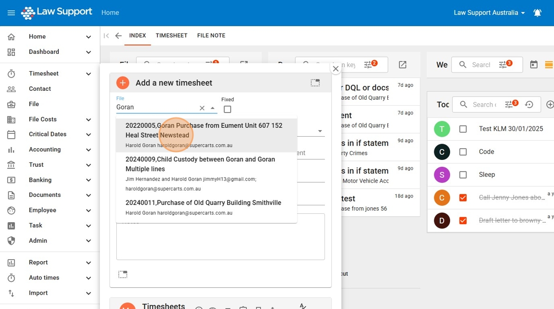 2. Type a few letters of the client name or matter to search for a file number. If you’ve already worked on a file today, the system will automatically insert the last used file.
