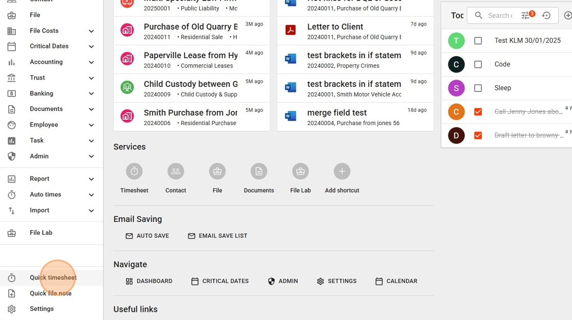 1. You can access Quick Timesheets from the left-hand menu at the bottom of the final section. The menu is organized into sections, with Quick Timesheets located in the last section for easy access.
