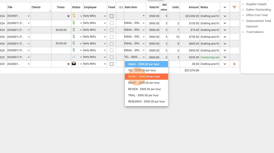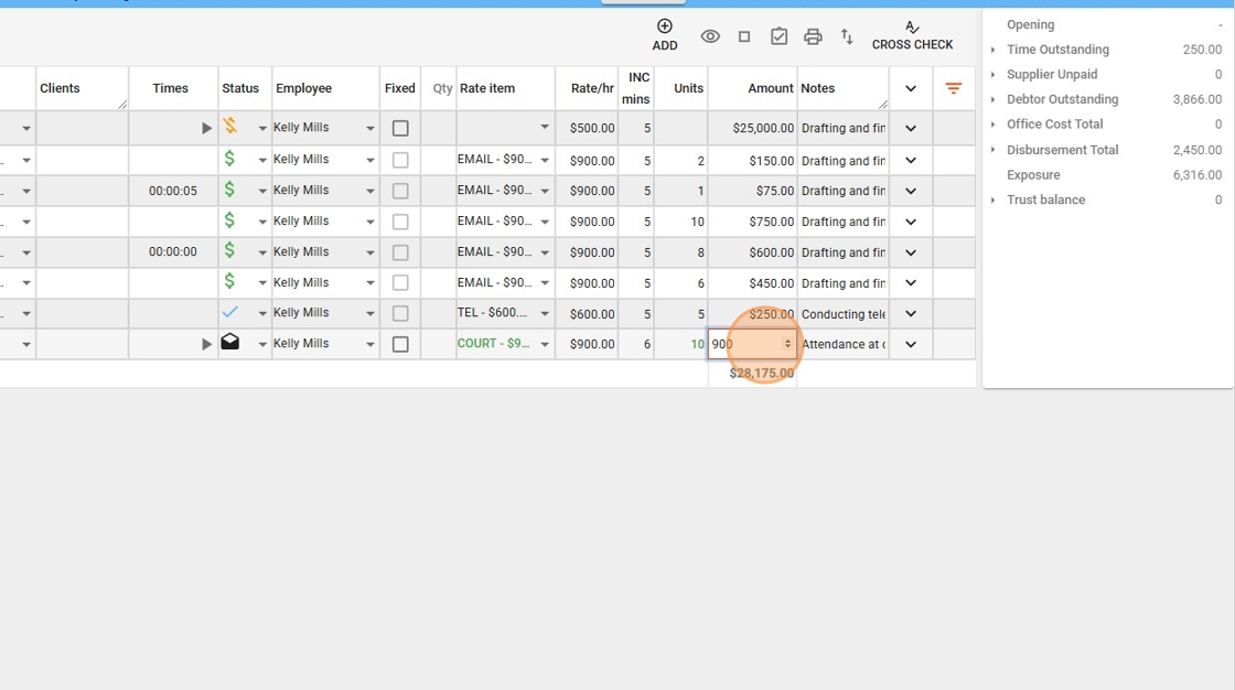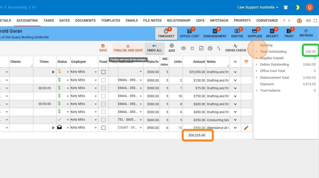 - The green rectangle at the top right indicates the total value of finalized but unbilled time entries, which are ready for billing.