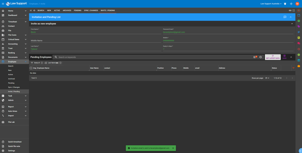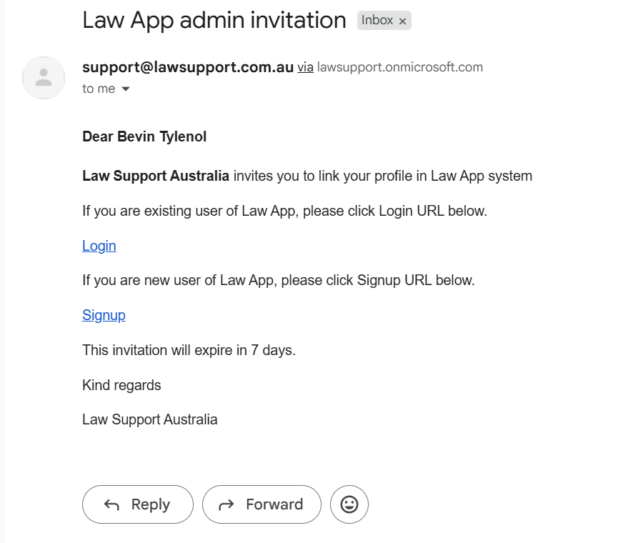 You will see a confirmation at the bottom of the screen and then the person you invited will receive and invite via email to create a new Law App user (see below)