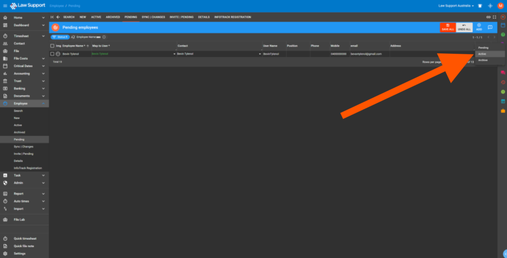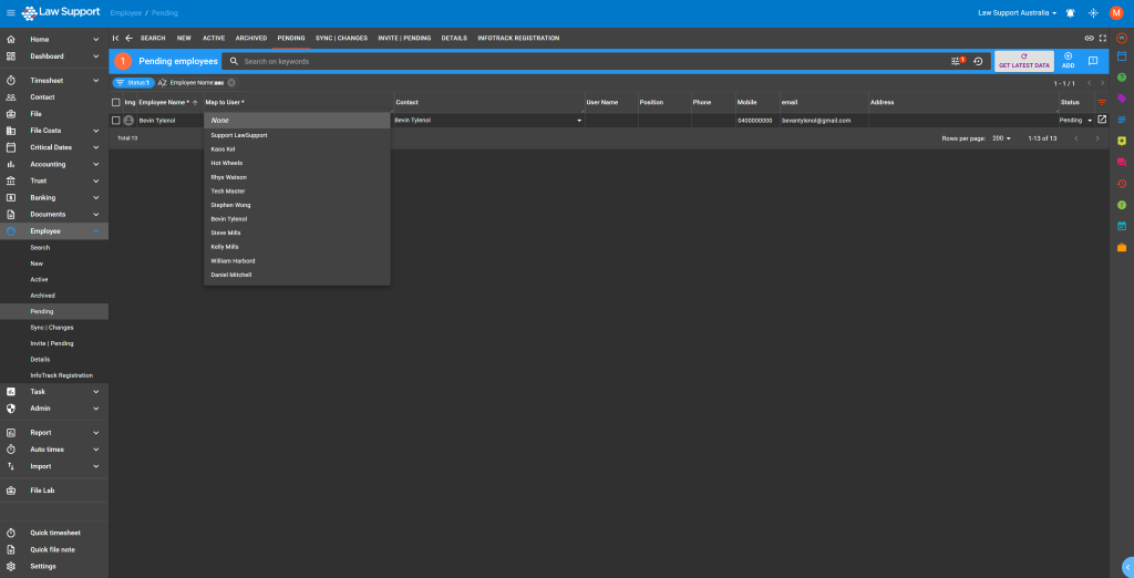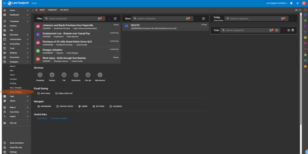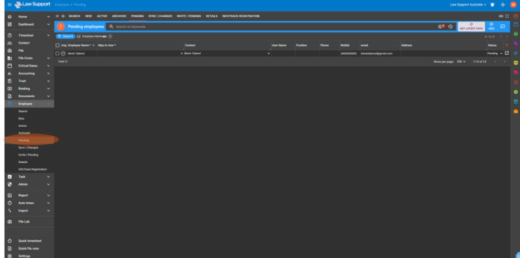 Once the person has completed the previous steps and created a Law App user you can then connect the them to your firm. To do this in the same Employee section go to “Pending”