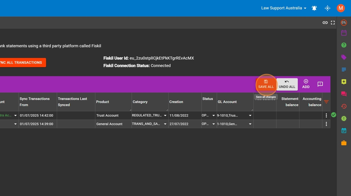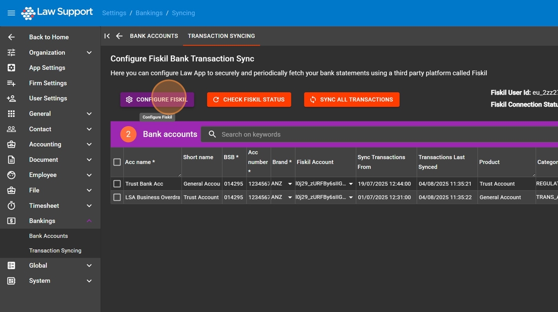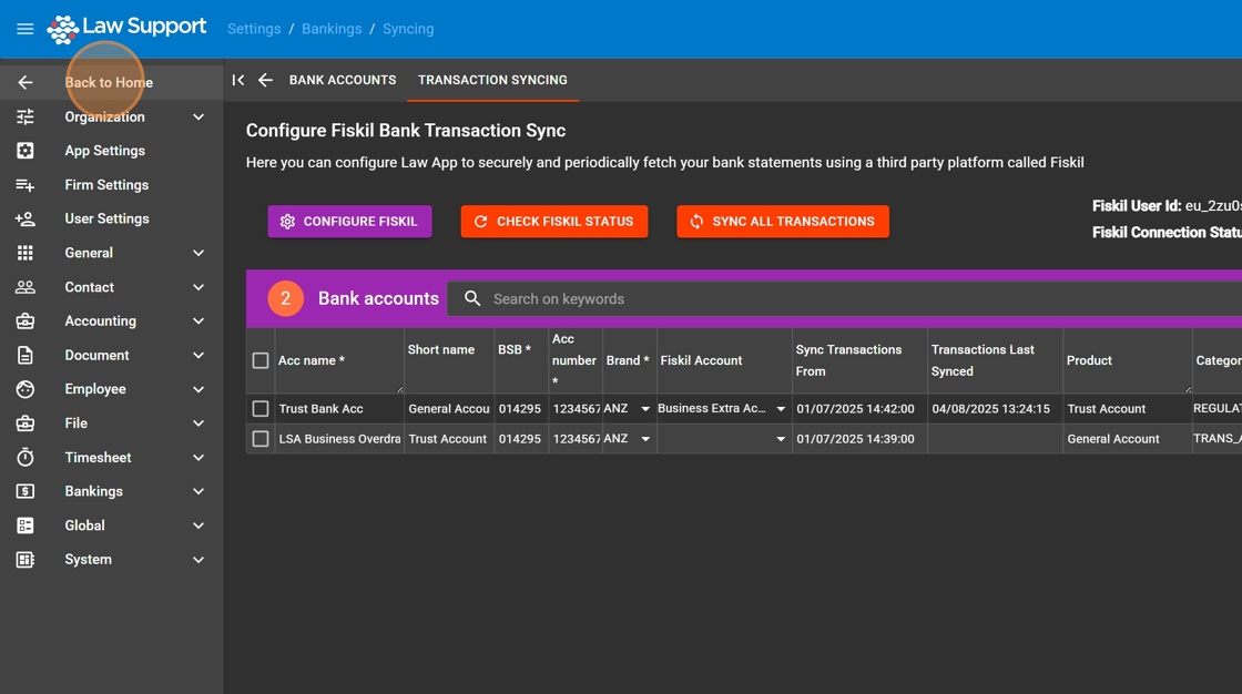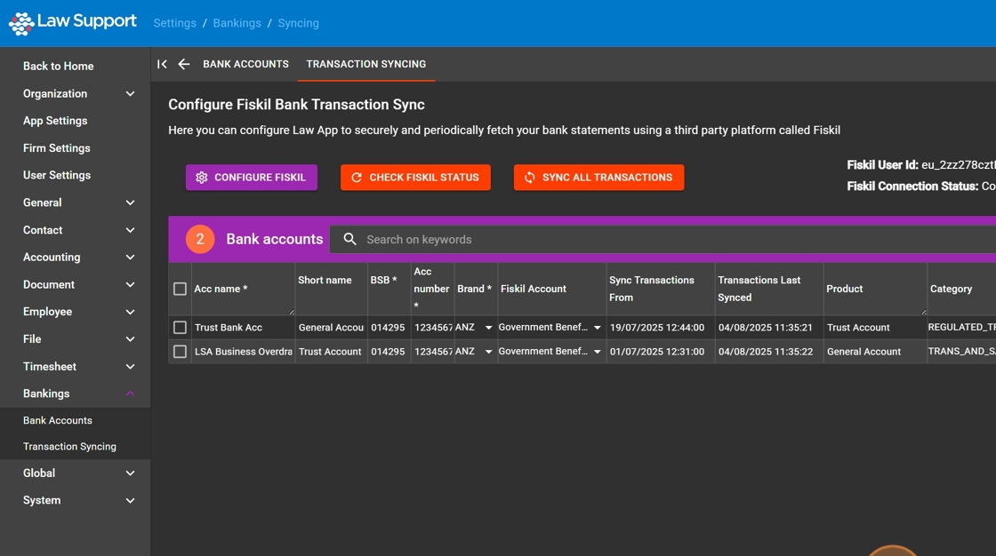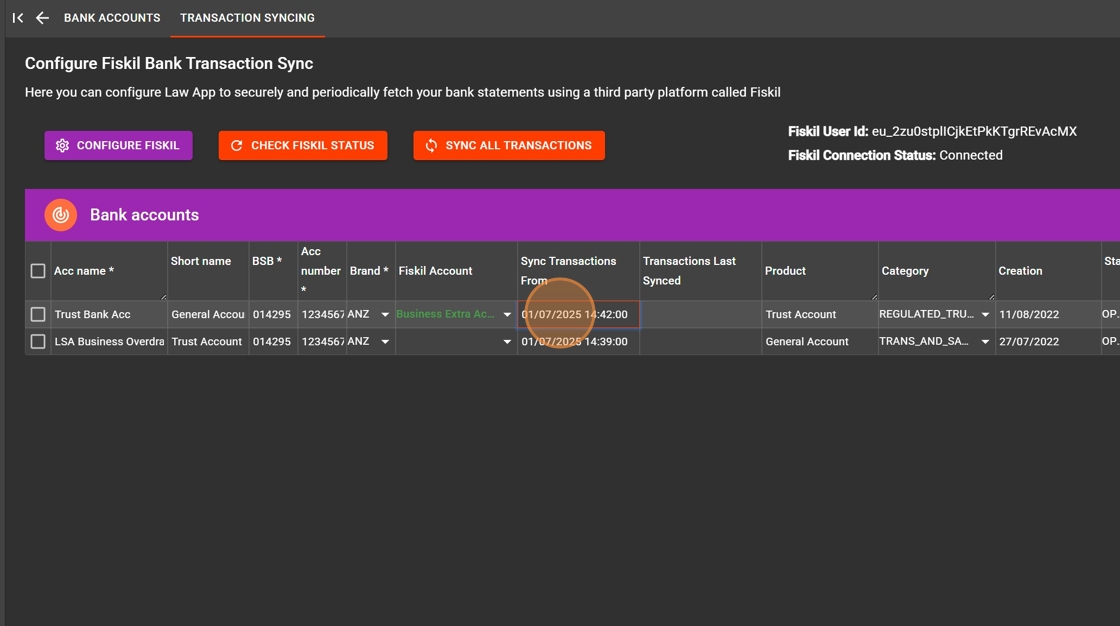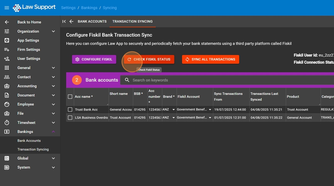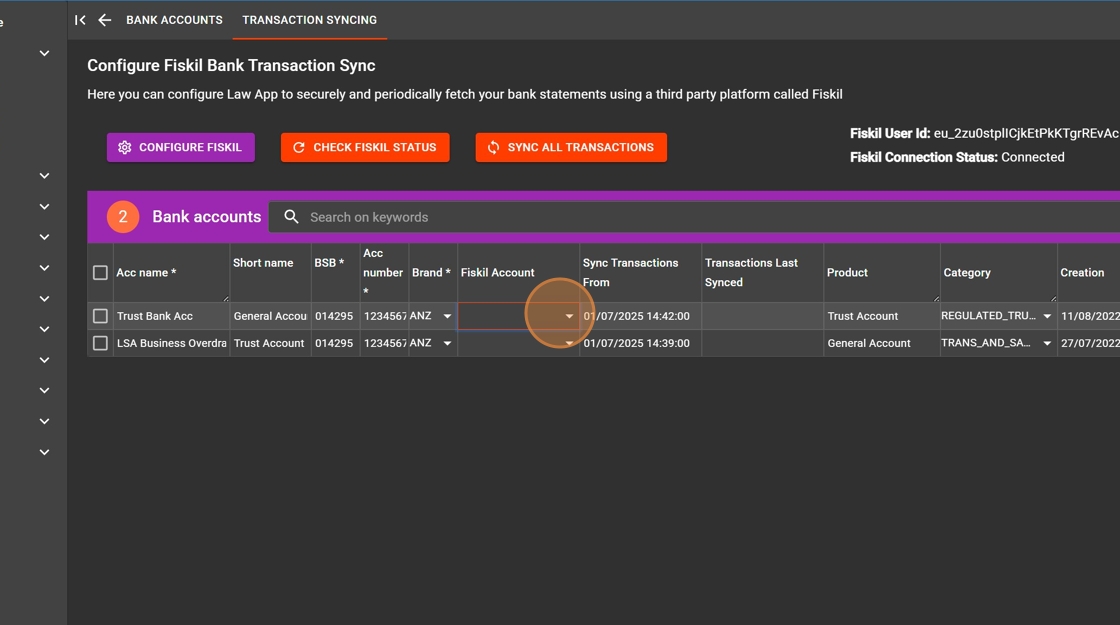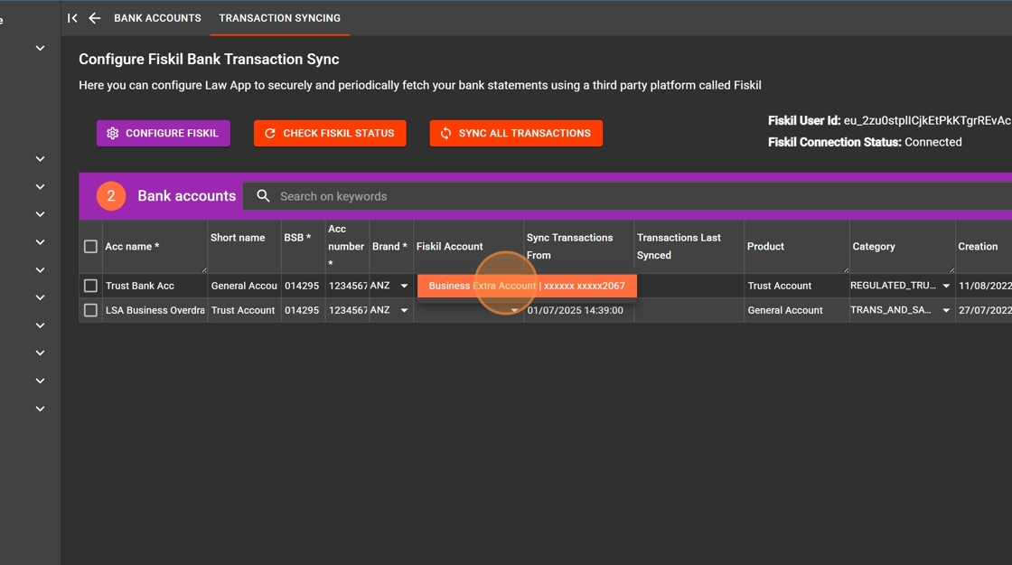 16. Your Fiskil Connection Status should be “Connected”, you can now link your bank accounts from Fiskil into the Law App Bank Accounts