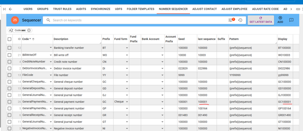 • GeneralPaymentNu… (Prefix: GC, Fund form: Cheque) — this is ID 26