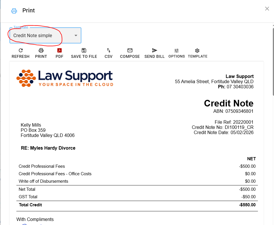 - From the invoice list, select the Credit Note layout for the newly created invoice.