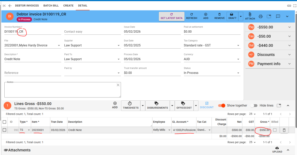 Scenario: A debtor invoice has already been finalised, but a correction is needed — for example, the wrong fee earner rates were applied, or professional fees were overcharged.
