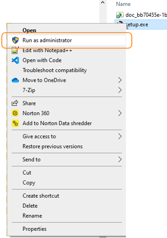 3. Right click on setup.exe and click “Run as administrator“